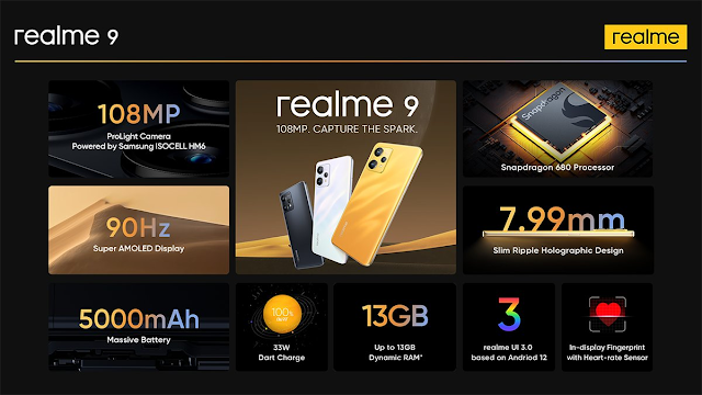 Realme 9 comes with 108MP Primary Camera, a 90Hz Super AMOLED Display, an In-display Fingerprint with a Heart Rate Sensor, a Snapdragon 680 Processor, 7.99mm thickness, 5000mAh of Battery along with 33W Fast Charging.